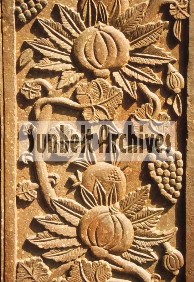 A sandstone carving of grapes and fruits in Jaipur, India.