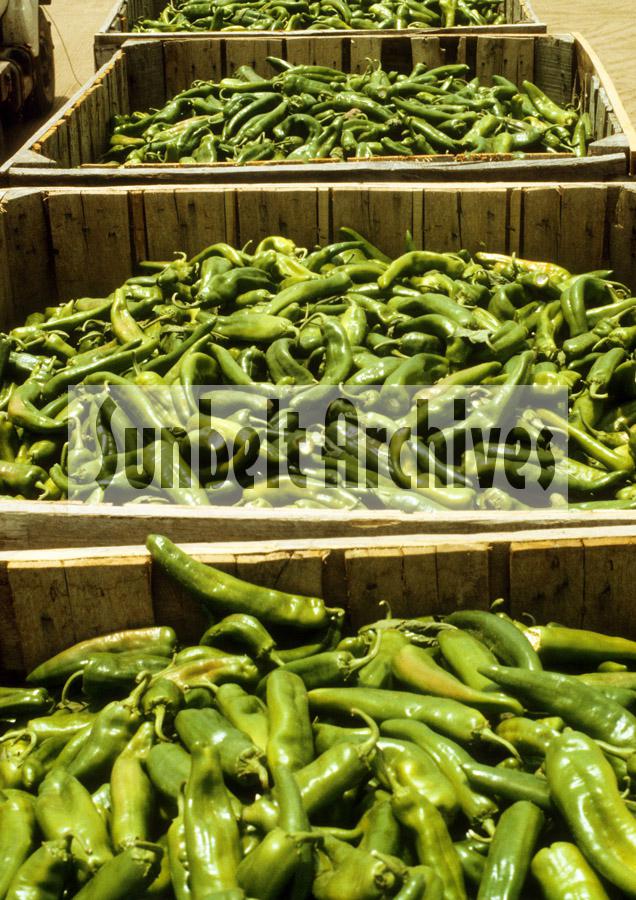Freshly harvested New Mexico green chiles await processing near Las Cruces, New Mexico.