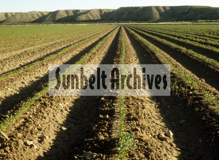 Direct-seeded seedlings emerge on tops of rows near Las Cruces, New Mexico.