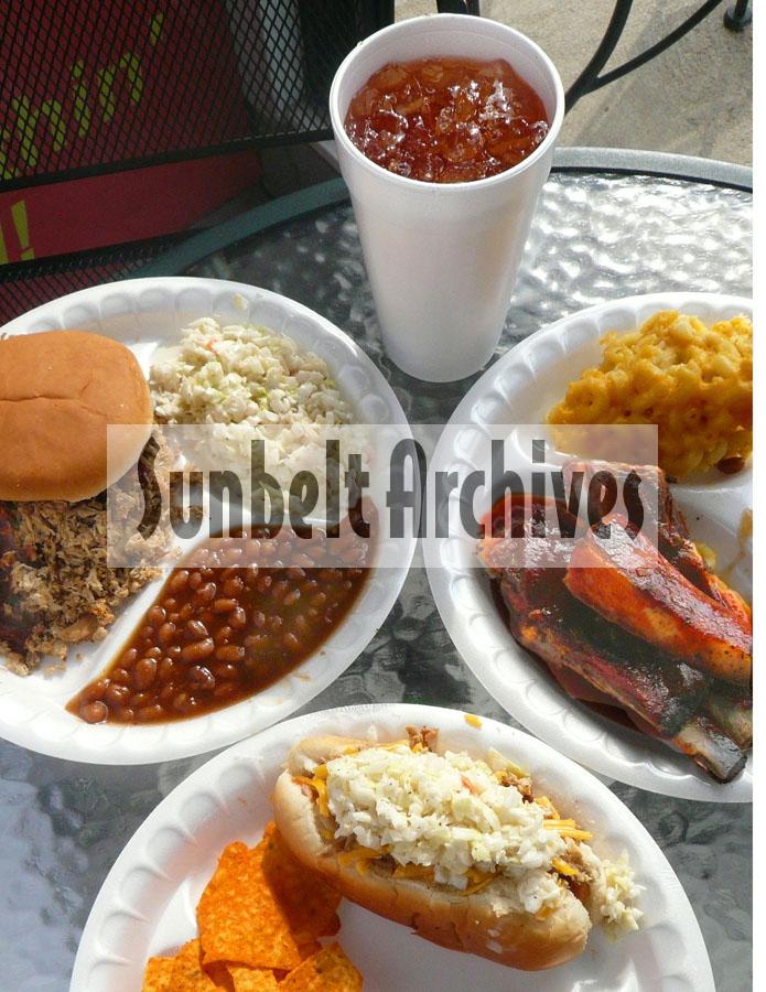 Pulled pork bbq sandwich, baked beans, cole slaw, ice tea, taco chips, hot dog with cole slaw & cheese, bbq ribs, macaroni and cheese.
