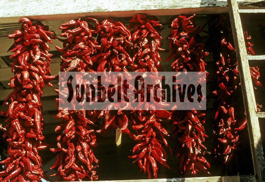 Ristras for sale at a market in Truth or Consequences, New Mexico.
