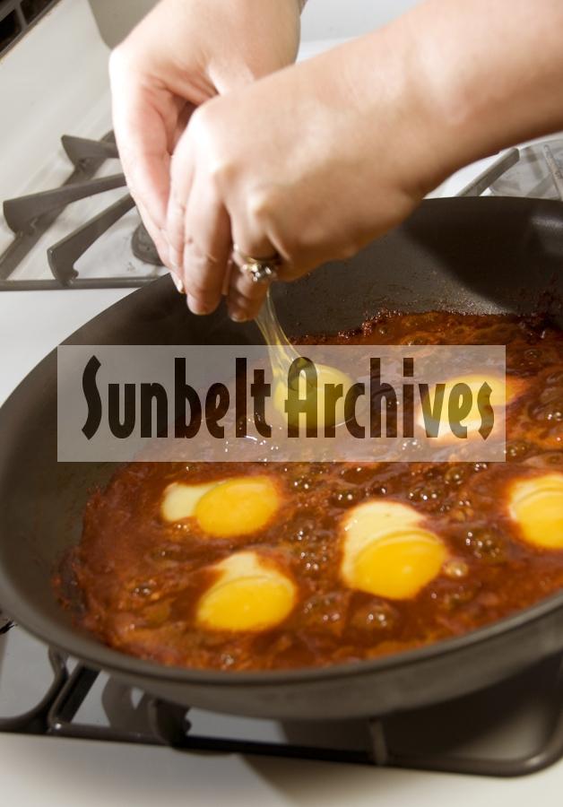 Eggs are poached in red chile sauce for the huevos rancheros (ranch-style eggs).